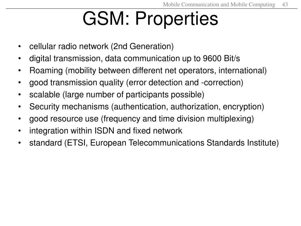 GSM: Properties • cellular radio network (2nd Generation) • digital transmission, data communication up to 9600 Bit/s • Roaming (mobility between different net operators, international) • good transmission quality (error detection and -correction) • scalable (large number of participants possible) • Security mechanisms (authentication, authorization, encryption) • good resource use (frequency and time division multiplexing) • integration within ISDN and fixed network • standard (ETSI, European Telecommunications Standards Institute)