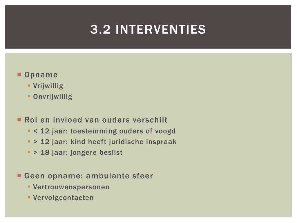 3.2 Interventies • Opname • Vrijwillig • Onvrijwillig • Rol en invloed van ouders verschilt • < 12 jaar: toestemming ouders of voogd • > 12 jaar: kind heeft juridische inspraak • > 18 jaar: jongere beslist • Geen opname: ambulante sfeer • Vertrouwenspersonen • Vervolgcontacten