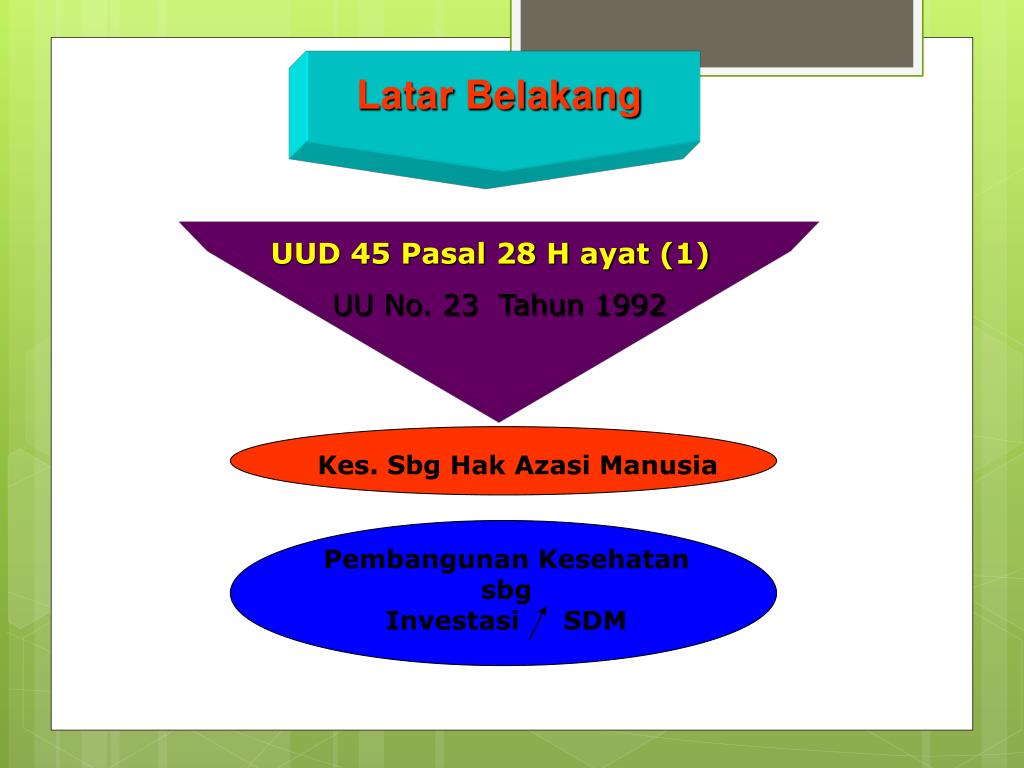 Latar Belakang UUD 45 Pasal 28 H ayat (1) UU No. 23 Tahun 1992 Kes. Sbg Hak Azasi Manusia Pembangunan Kesehatan sbg Investasi SDM