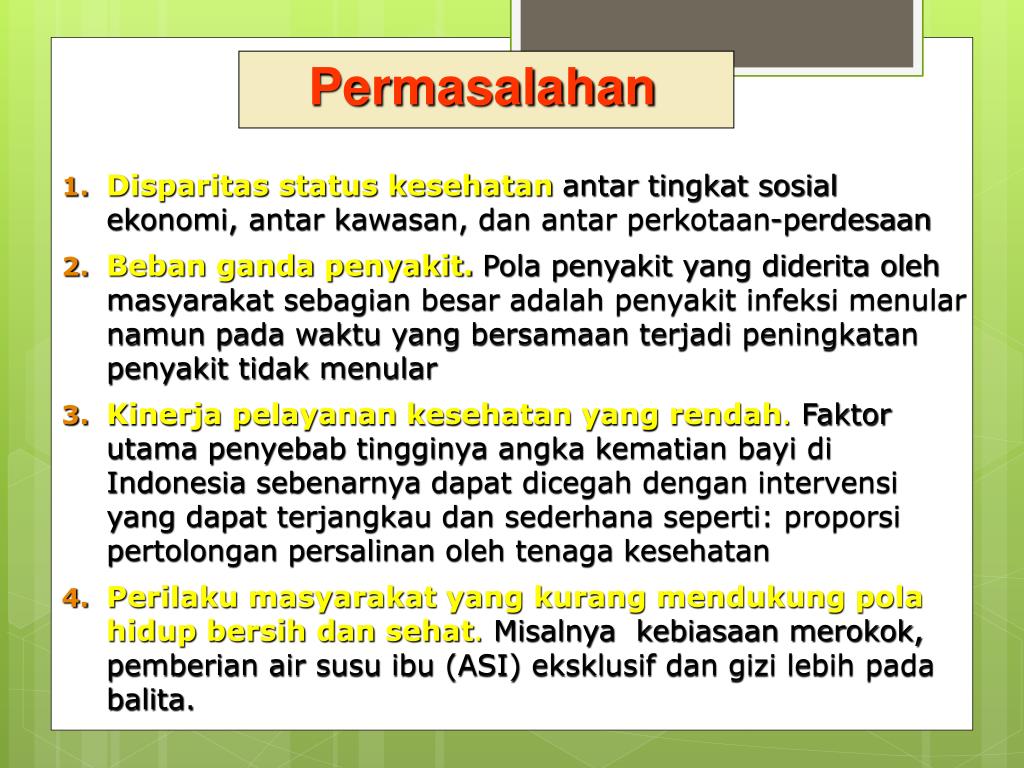 Permasalahan • Disparitas status kesehatan antar tingkat sosial ekonomi, antar kawasan, dan antar perkotaan-perdesaan • Beban ganda penyakit.Pola penyakit yang diderita oleh masyarakat sebagian besar adalah penyakit infeksi menular namun pada waktu yang bersamaan terjadi peningkatan penyakit tidak menular • Kinerja pelayanan kesehatan yang rendah. Faktor utama penyebab tingginya angka kematian bayi di Indonesia sebenarnya dapat dicegah dengan intervensi yang dapat terjangkau dan sederhana seperti: proporsi pertolongan persalinan oleh tenaga kesehatan • Perilaku masyarakat yang kurang mendukung pola hidup bersih dan sehat. Misalnya kebiasaan merokok, pemberian air susu ibu (ASI) eksklusif dan gizi lebih pada balita.