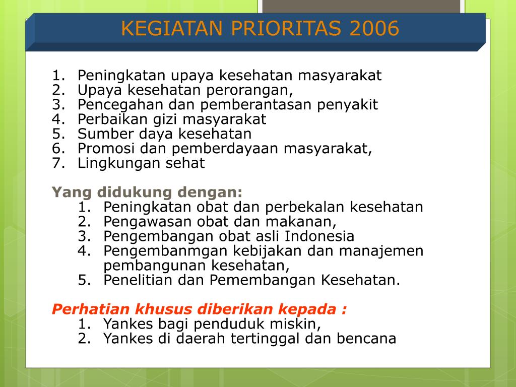 KEGIATAN PRIORITAS 2006 • Peningkatan upaya kesehatan masyarakat • Upaya kesehatan perorangan, • Pencegahan dan pemberantasan penyakit • Perbaikan gizi masyarakat • Sumber daya kesehatan • Promosi dan pemberdayaan masyarakat, • Lingkungan sehat • Yang didukung dengan: • Peningkatan obat dan perbekalan kesehatan • Pengawasan obat dan makanan, • Pengembangan obat asli Indonesia • Pengembanmgan kebijakan dan manajemen pembangunan kesehatan, • Penelitian dan Pemembangan Kesehatan. • Perhatian khusus diberikan kepada : • Yankes bagi penduduk miskin, • Yankes di daerah tertinggal dan bencana