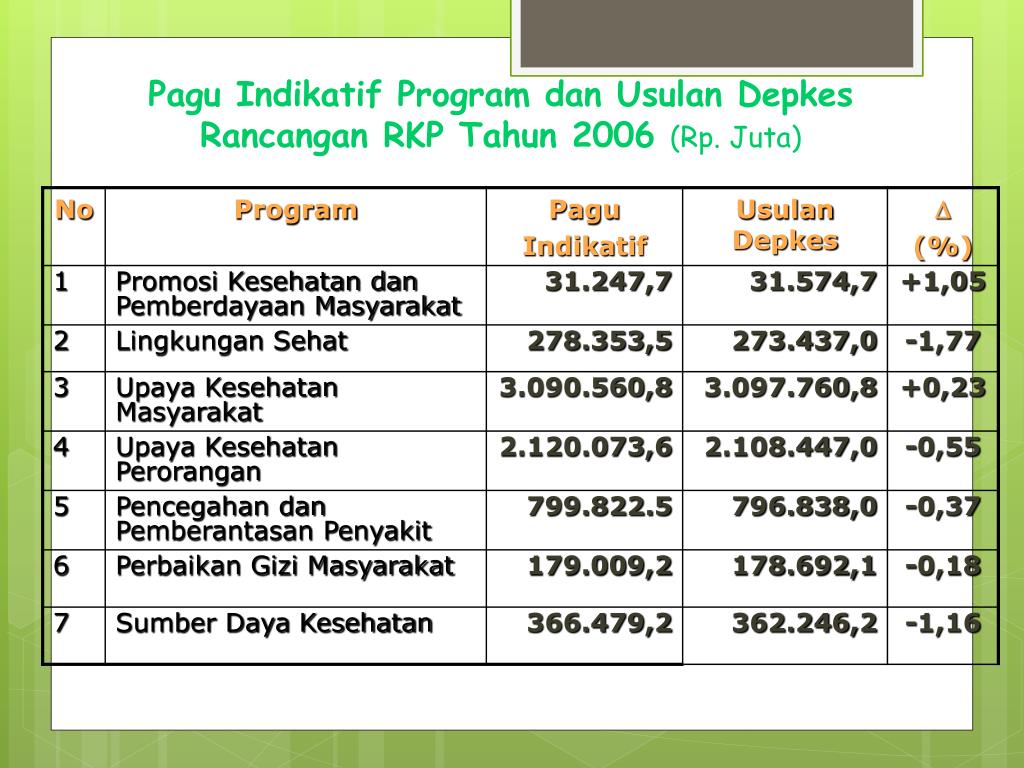 Pagu Indikatif Program dan Usulan Depkes Rancangan RKP Tahun 2006 (Rp. Juta) Catatan: Pagu Indikatif RKP Tahun 2006 untuk Depkes = Rp. 9.263.401,7 juta,. Usulan perbaikan pagu oleh Depkes di atas tetap sesuai dengan pagu indikatif yang ditetapkan oleh SEB Menteri PPN/Bappenas dan Menteri Keuangan.