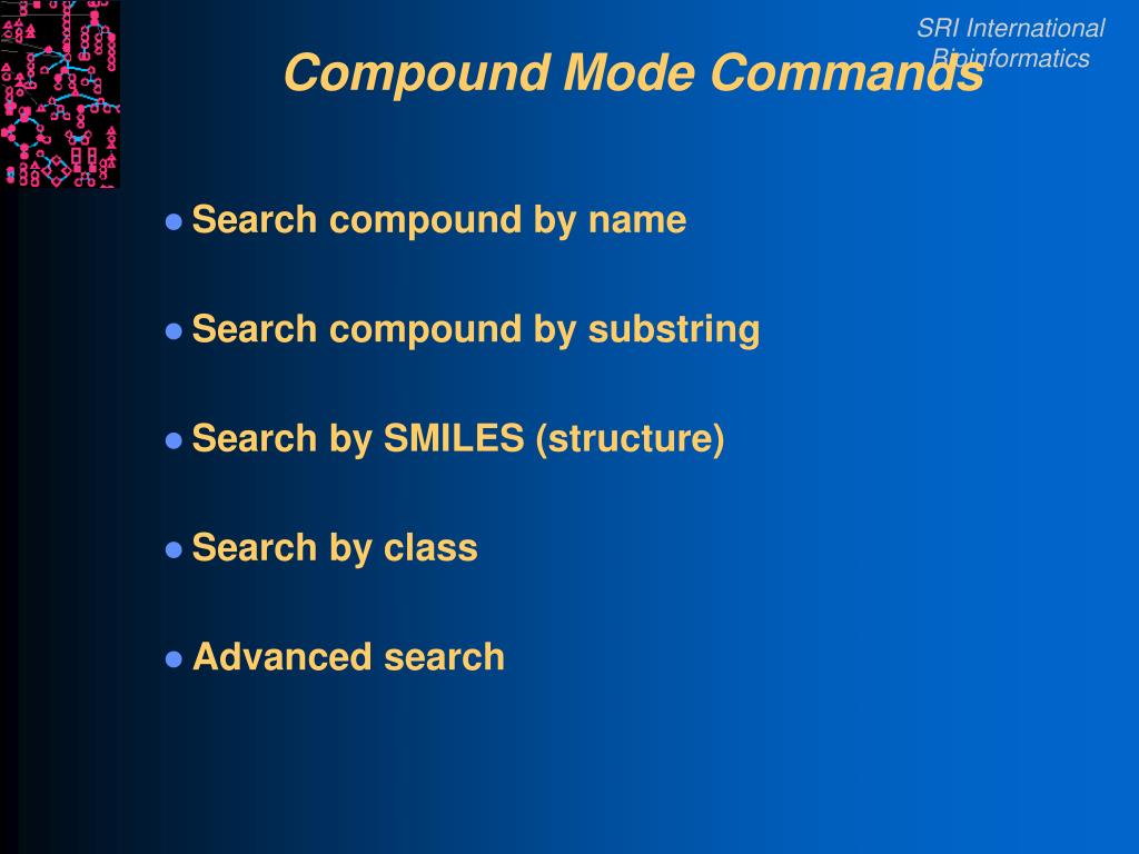 Compound Mode Commands • Search compound by name • Search compound by substring • Search by SMILES (structure) • Search by class • Advanced search