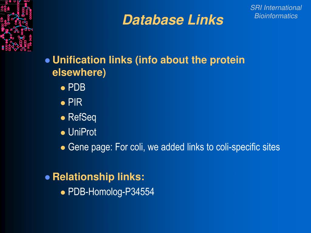 Database Links • Unification links (info about the protein elsewhere) • PDB • PIR • RefSeq • UniProt • Gene page: For coli, we added links to coli-specific sites • Relationship links: • PDB-Homolog-P34554
