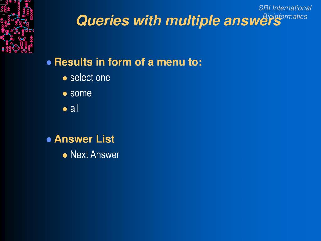 Queries with multiple answers • Results in form of a menu to: • select one • some • all • Answer List • Next Answer