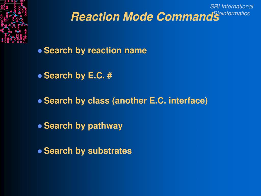 Reaction Mode Commands • Search by reaction name • Search by E.C. # • Search by class (another E.C. interface) • Search by pathway • Search by substrates