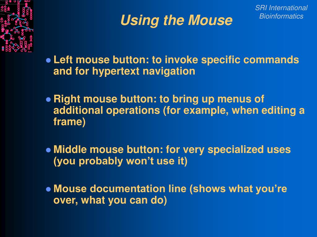 Using the Mouse • Left mouse button: to invoke specific commands and for hypertext navigation • Right mouse button: to bring up menus of additional operations (for example, when editing a frame) • Middle mouse button: for very specialized uses (you probably won’t use it) • Mouse documentation line (shows what you’re over, what you can do)