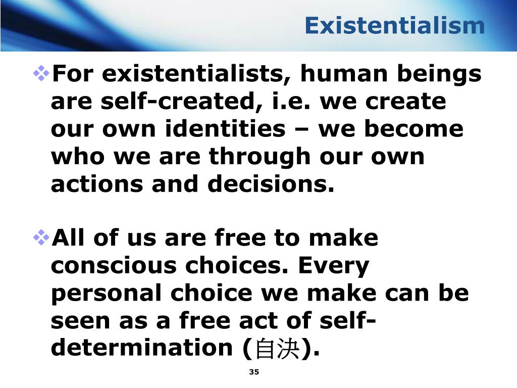 Existentialism • For existentialists, human beings are self-created, i.e. we create our own identities – we become who we are through our own actions and decisions. • All of us are free to make conscious choices. Every personal choice we make can be seen as a free act of self-determination(自決).