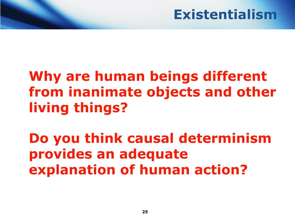 Existentialism Why are human beings different from inanimate objects and other living things? Do you think causal determinism provides an adequate explanation of human action?