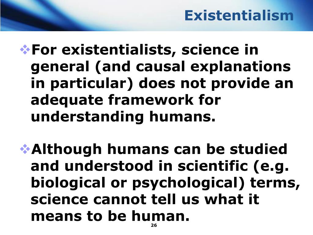 Existentialism • For existentialists, science in general (and causal explanations in particular) does not provide an adequate framework for understanding humans. • Although humans can be studied and understood in scientific (e.g. biological or psychological) terms, science cannot tell us what it means to be human.