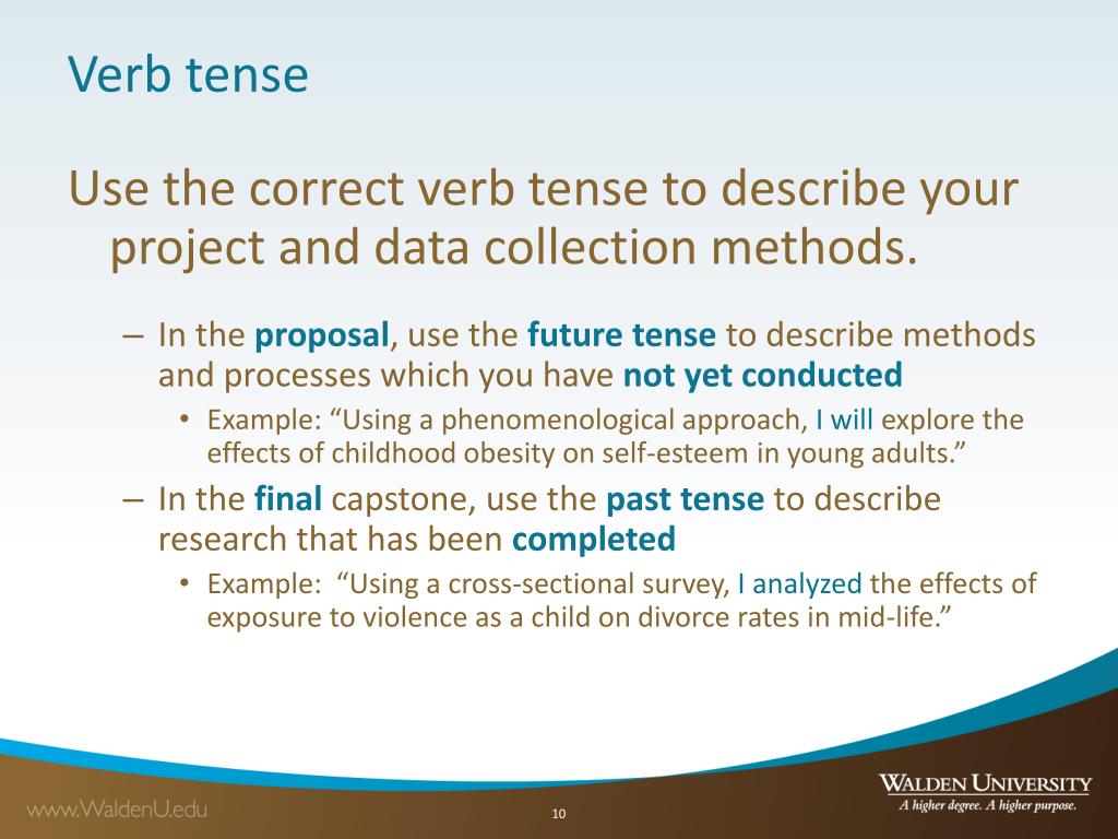 Verb tense Use the correct verb tense to describe your project and data collection methods. • In the proposal, use the futuretenseto describe methods and processes which you have not yet conducted • Example: “Using a phenomenological approach, I will explore the effects of childhood obesity on self-esteem in young adults.” • In the final capstone, use the past tense to describe research that has been completed • Example: “Using a cross-sectional survey, I analyzed the effects of exposure to violence as a child on divorce rates in mid-life.”