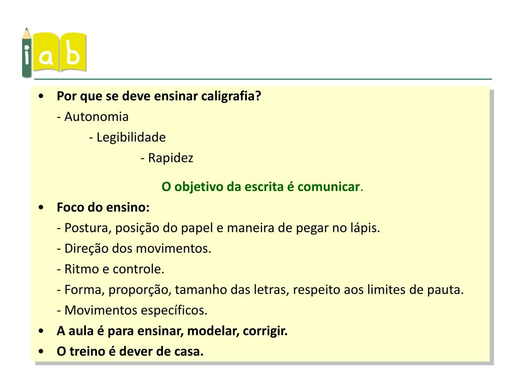 Por que se deve ensinar caligrafia? • - Autonomia • - Legibilidade • - Rapidez • O objetivo da escrita é comunicar. • Foco do ensino: • - Postura, posição do papel e maneira de pegar no lápis. • - Direção dos movimentos. • - Ritmo e controle. • - Forma, proporção, tamanho das letras, respeito aos limites de pauta. • - Movimentos específicos. • A aula é para ensinar, modelar, corrigir. • O treino é dever de casa.