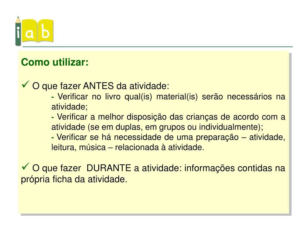 Como utilizar: • O que fazer ANTES da atividade: • -Verificar no livro qual(is) material(is) serão necessários na atividade; • - Verificar a melhor disposição das crianças de acordo com a atividade (se em duplas, em grupos ou individualmente); • - Verificar se há necessidade de uma preparação – atividade, leitura, música – relacionada à atividade. • O que fazer DURANTE a atividade: informações contidas na própria ficha da atividade.