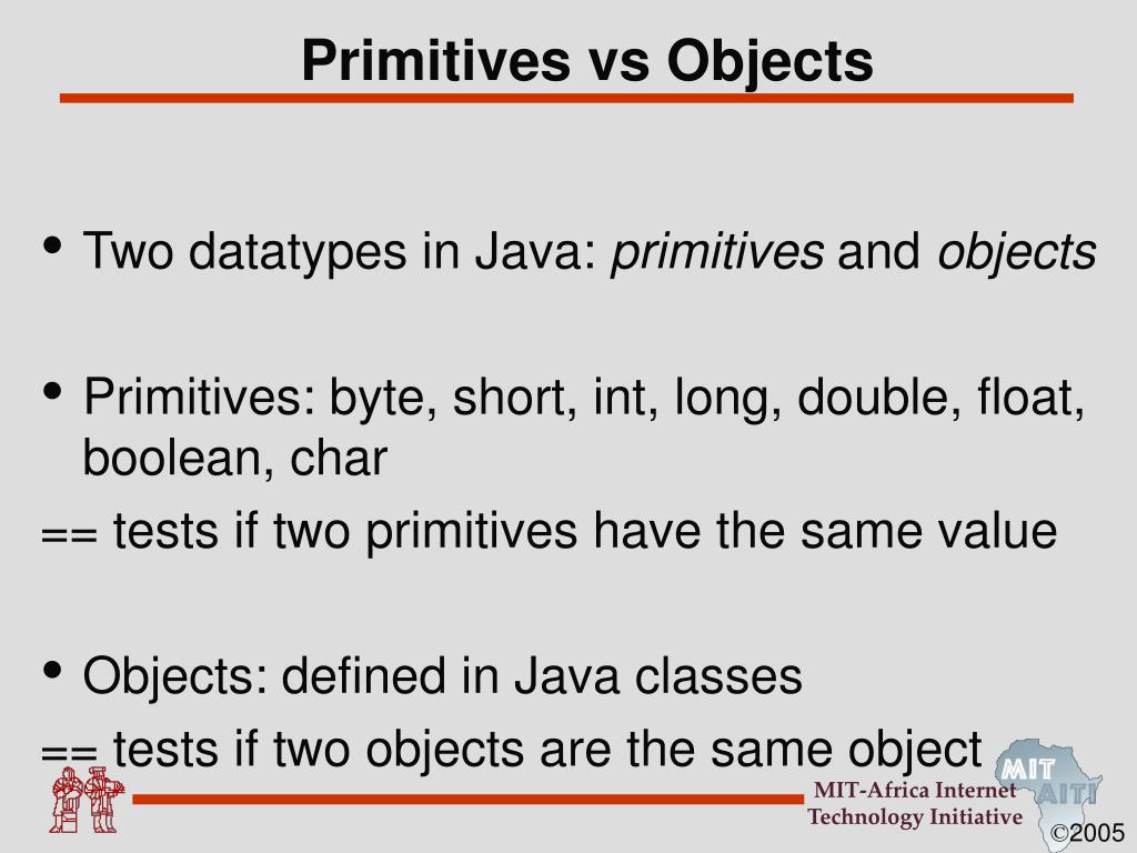 Primitives vs Objects • Two datatypes in Java: primitives and objects • Primitives: byte, short, int, long, double, float, boolean, char == tests if two primitives have the same value • Objects: defined in Java classes == tests if two objects are the same object