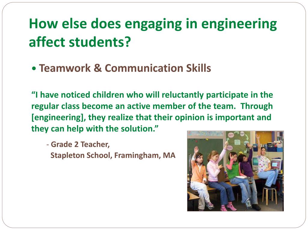 How else does engaging in engineering affect students? • Teamwork & Communication Skills “I have noticed children who will reluctantly participate in the regular class become an active member of the team. Through [engineering], they realize that their opinion is important and they can help with the solution.” - Grade 2 Teacher, Stapleton School, Framingham, MA