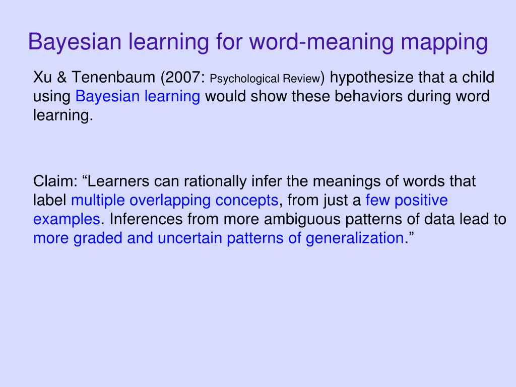 Bayesian learning for word-meaning mapping Xu & Tenenbaum (2007: Psychological Review) hypothesize that a child using Bayesian learning would show these behaviors during word learning. Claim: “Learners can rationally infer the meanings of words that label multiple overlapping concepts, from just a few positive examples. Inferences from more ambiguous patterns of data lead to more graded and uncertain patterns of generalization.”