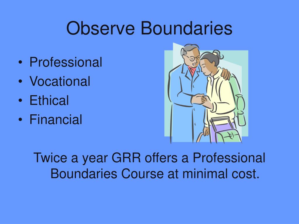 Observe Boundaries • Professional • Vocational • Ethical • Financial Twice a year GRR offers a Professional Boundaries Course at minimal cost.