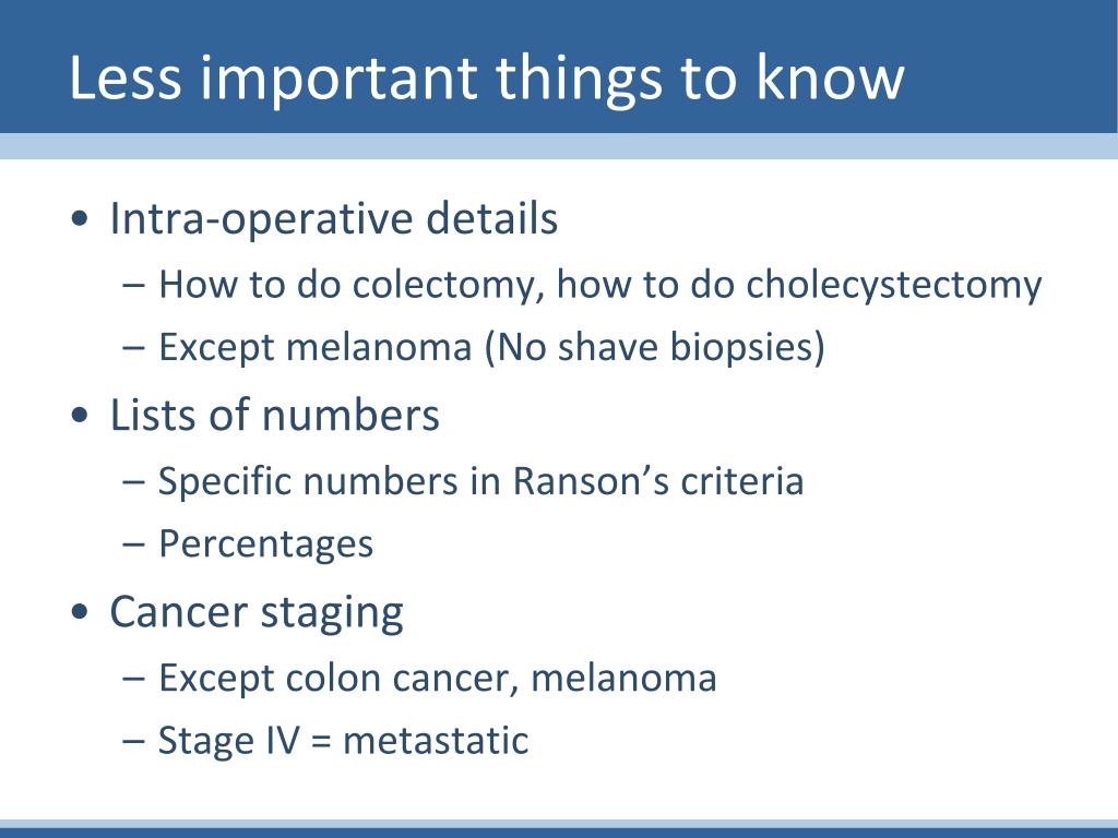 Less important things to know • Intra-operative details • How to do colectomy, how to do cholecystectomy • Except melanoma (No shave biopsies) • Lists of numbers • Specific numbers in Ranson’s criteria • Percentages • Cancer staging • Except colon cancer, melanoma • Stage IV = metastatic