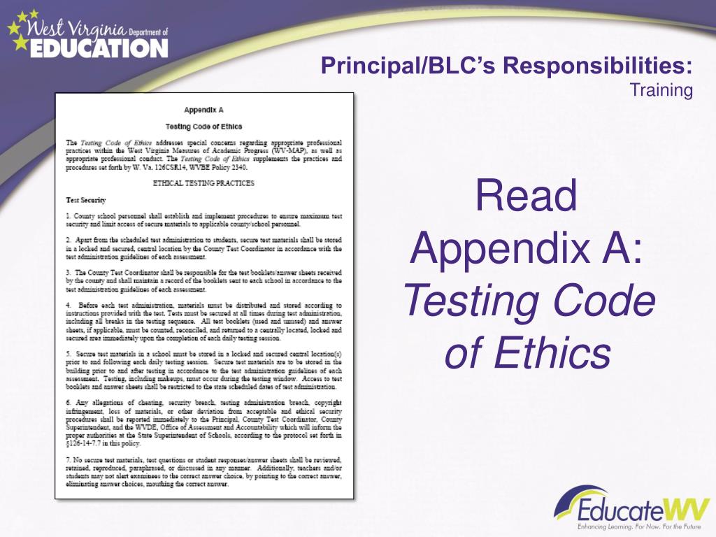 Read Appendix A: Testing Code of Ethics Principal/BLC’s Responsibilities: Training
