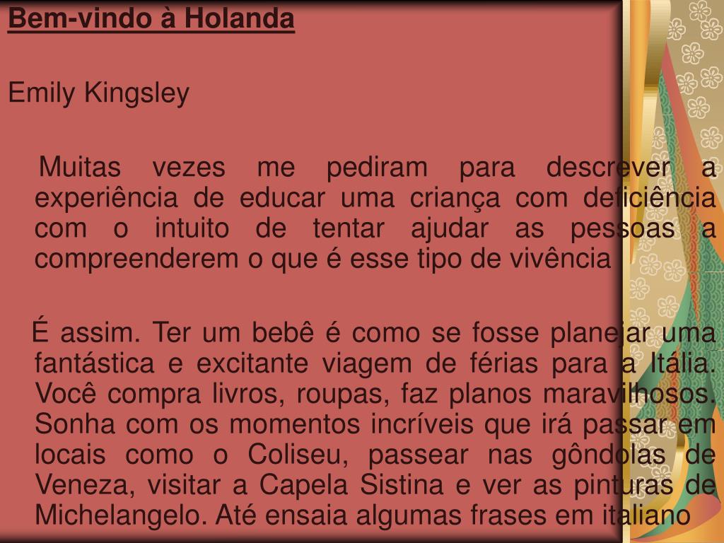 Bem-vindo à Holanda Emily Kingsley Muitas vezes me pediram para descrever a experiência de educar uma criança com deficiência com o intuito de tentar ajudar as pessoas a compreenderem o que é esse tipo de vivência