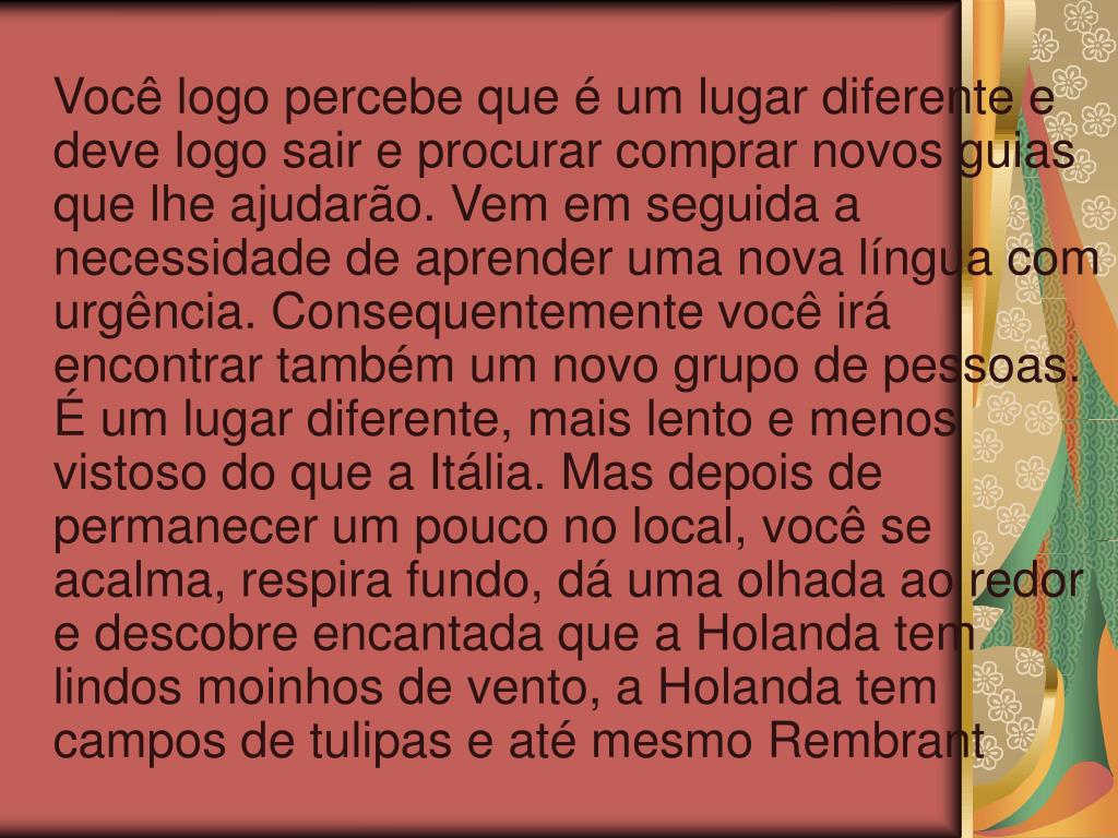 Você logo percebe que é um lugar diferente e deve logo sair e procurar comprar novos guias que lhe ajudarão. Vem em seguida a necessidade de aprender uma nova língua com urgência. Consequentemente você irá encontrar também um novo grupo de pessoas. É um lugar diferente, mais lento e menos vistoso do que a Itália. Mas depois de permanecer um pouco no local, você se acalma, respira fundo, dá uma olhada ao redor e descobre encantada que a Holanda tem lindos moinhos de vento, a Holanda tem campos de tulipas e até mesmo Rembrant