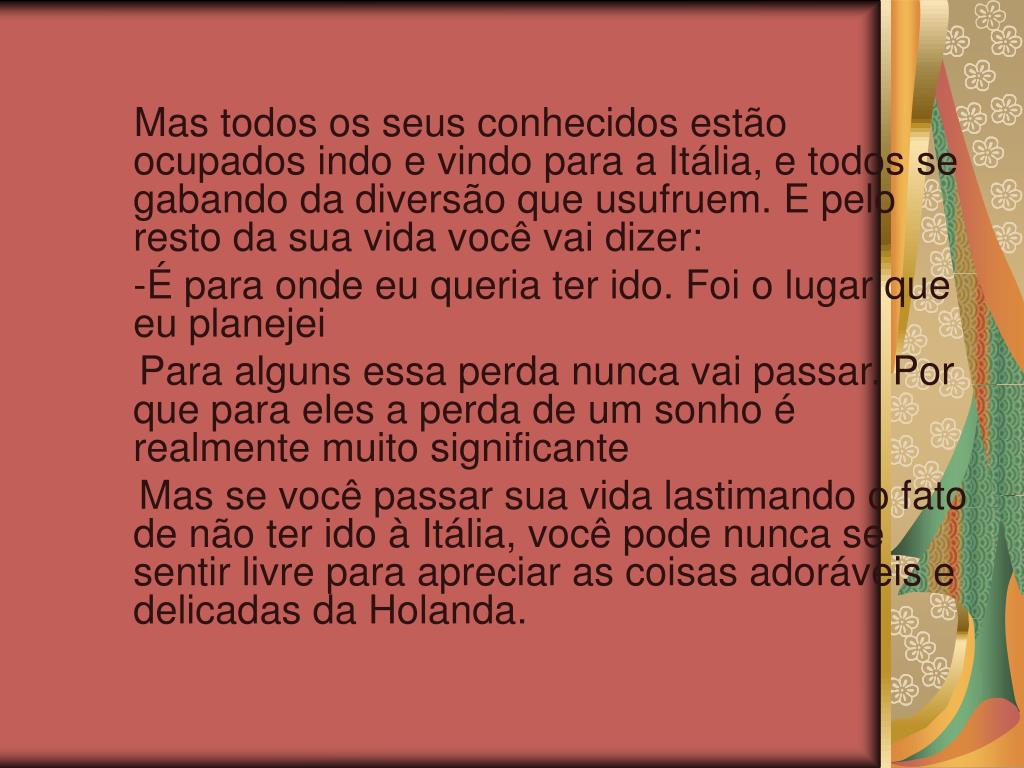 Mas todos os seus conhecidos estão ocupados indo e vindo para a Itália, e todos se gabando da diversão que usufruem. E pelo resto da sua vida você vai dizer: -É para onde eu queria ter ido. Foi o lugar que eu planejei Para alguns essa perda nunca vai passar. Por que para eles a perda de um sonho é realmente muito significante Mas se você passar sua vida lastimando o fato de não ter ido à Itália, você pode nunca se sentir livre para apreciar as coisas adoráveis e delicadas da Holanda.