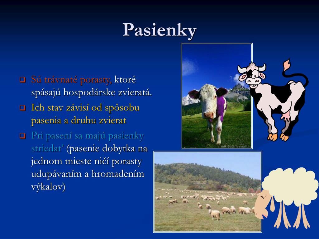Pasienky • Sú trávnaté porasty, ktoré spásajú hospodárske zvieratá. • Ich stav závisí od spôsobu pasenia a druhu zvierat • Pri pasení sa majú pasienky striedať (pasenie dobytka na jednom mieste ničí porasty udupávaním a hromadením výkalov)
