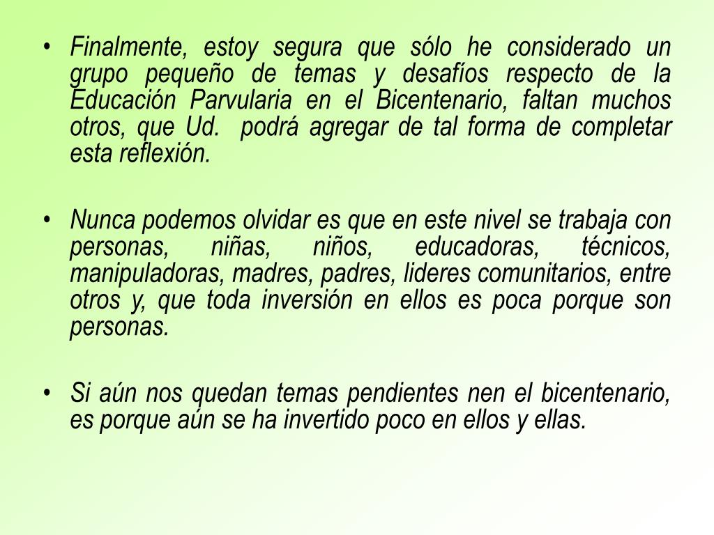 Finalmente, estoy segura que sólo he considerado un grupo pequeño de temas y desafíos respecto de la Educación Parvularia en el Bicentenario, faltan muchos otros, que Ud. podrá agregar de tal forma de completar esta reflexión. • Nunca podemos olvidar es que en este nivel se trabaja con personas, niñas, niños, educadoras, técnicos, manipuladoras, madres, padres, lideres comunitarios, entre otros y, que toda inversión en ellos es poca porque son personas. • Si aún nos quedan temas pendientes nen el bicentenario, es porque aún se ha invertido poco en ellos y ellas.
