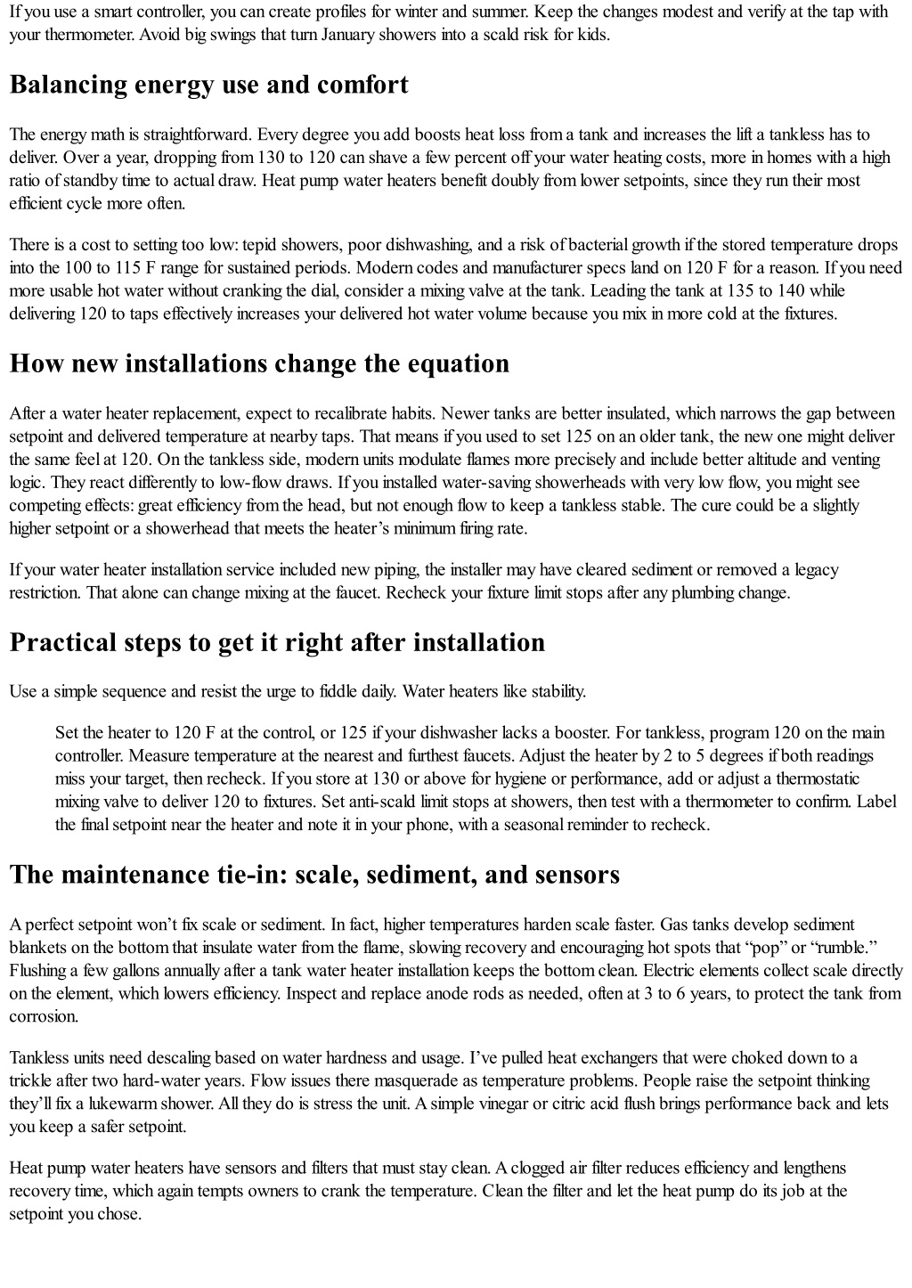 more sway over safety, energy use, appliance life, and even dishwashing results than any other quick setting. The right temperature is a balancing act between comfort, efficiency, and scald prevention, and it doesn’t look the same for every household. What follows comes from years of crawling into tight utility closets, troubleshooting lukewarm complaints, and explaining why 140 degrees Fahrenheit isn’t overkill in some homes and too hot in others. Whether you went with a tank water heater installation or a tankless water heater installation, the principles are the same, with a few key differences in how you dial things in. Why the setpoint matters more than most people think Temperature control sets the boundaries for everything your water heater does. On the safety side, bacteria can grow in warm but not-hot water, and scalds happen fast when faucets deliver water that’s just a little too hot. The comfort side is obvious: showers should be steady, not a roller coaster when someone flushes a toilet. On the financial side, the setpoint affects how hard your heater works and how much heat you lose through the tank walls and hot water piping. In a tank water heater, higher temperature means more standby loss. Heat leaks through insulation minute by minute. With tankless, standby loss is nearly zero, but the heater’s capacity and flow rate are tied to how many degrees it needs to raise incoming water. Ask a tankless heater to lift cold groundwater by 80 degrees instead of 60 and you’ll see the maximum flow rate drop. These physics drive real-world performance. The other angle people miss is hygiene. Certain temperatures slow Legionella growth, which matters in households with older adults, infants, or anyone with compromised immunity. That doesn’t mean you should take scalding showers. It means you might store water hotter at the heater and temper it down at the faucets. More on that shortly. The universal starting point: 120 degrees Fahrenheit Most homes do well with a setpoint of 120 F. That temperature strikes a workable balance. It’s hot enough for laundry enzymes and dish soap to work, gentle enough to reduce scald risk with typical mixing at the faucet, and efficient enough for daily use. If you just completed a water heater installation service and want a plug-and-play answer, use 120 as your baseline. Even at 120, toddlers and seniors can be vulnerable to scalds if hot water is not mixed properly. Faucet and shower trim often include limit stops that can be adjusted to cap the maximum hot mix. If you have small children, adjust these stops after the water heater installation so the handle can’t swing to a position that mixes too much hot. When 120 F isn’t the right answer There are exceptions. In my experience, about a quarter of households need a different setpoint because of climate, piping layout, or specific health safeguards. Cold groundwater: In northern climates, winter incoming water can be 40 to 50 F. If you like 105 to 110 F showers and you run multiple fixtures, a tankless unit might struggle if set too low. Bumping the setpoint to 125 or 130 can restore comfortable flow. For a tank unit, increasing to 125 can improve recovery and stretch capacity, since hotter stored water stretches further when mixed with cold at the faucet. Long pipe runs: Big homes with long distribution lines can lose several degrees between heater and shower. If you’ve got a run to a distant bathroom and no recirculation loop, a small increase at the heater can offset that piping loss. Better yet, insulate those hot water lines and consider on-demand recirculation to limit waste. Immunocompromised residents: Doctors sometimes recommend hotter storage temperatures for households where Legionella risk is a concern. Storing at 135 to 140 F, then using a mixing valve to deliver 120 F to fixtures, reduces bacterial growth in the tank while protecting occupants from scalds. This is a common specification in healthcare facilities and a sensible home practice when immunity is a concern. Dishwasher without internal booster: Many modern dishwashers have an internal heater that boosts temperature. Older models may not. If dishes come out greasy or cloudy, check the appliance manual. You might need 125 to 130 F at the dishwasher supply for proper cleaning. A point-of-use booster heater is another option.