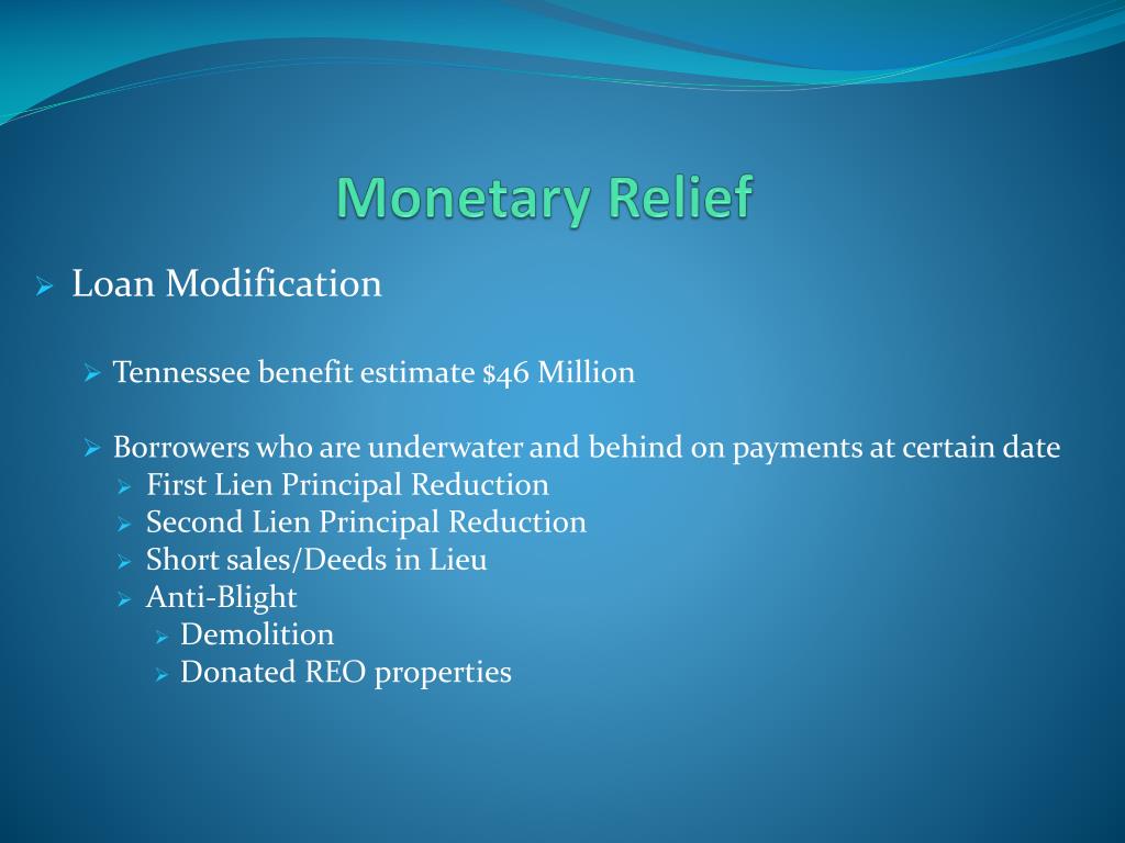 Monetary Relief Loan Modification Tennessee benefit estimate $46 Million Borrowers who are underwater and behind on payments at certain date First Lien Principal Reduction Second Lien Principal Reduction Short sales/Deeds in Lieu Anti-Blight Demolition Donated REO properties