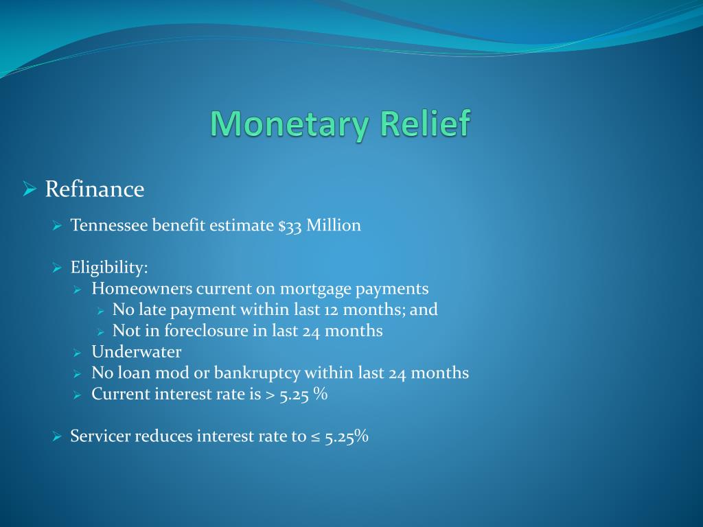 Monetary Relief Refinance Tennessee benefit estimate $33 Million Eligibility: Homeowners current on mortgage payments No late payment within last 12 months; and Not in foreclosure in last 24 months Underwater No loan mod or bankruptcy within last 24 months Current interest rate is > 5.25 % Servicer reduces interest rate to ≤ 5.25%