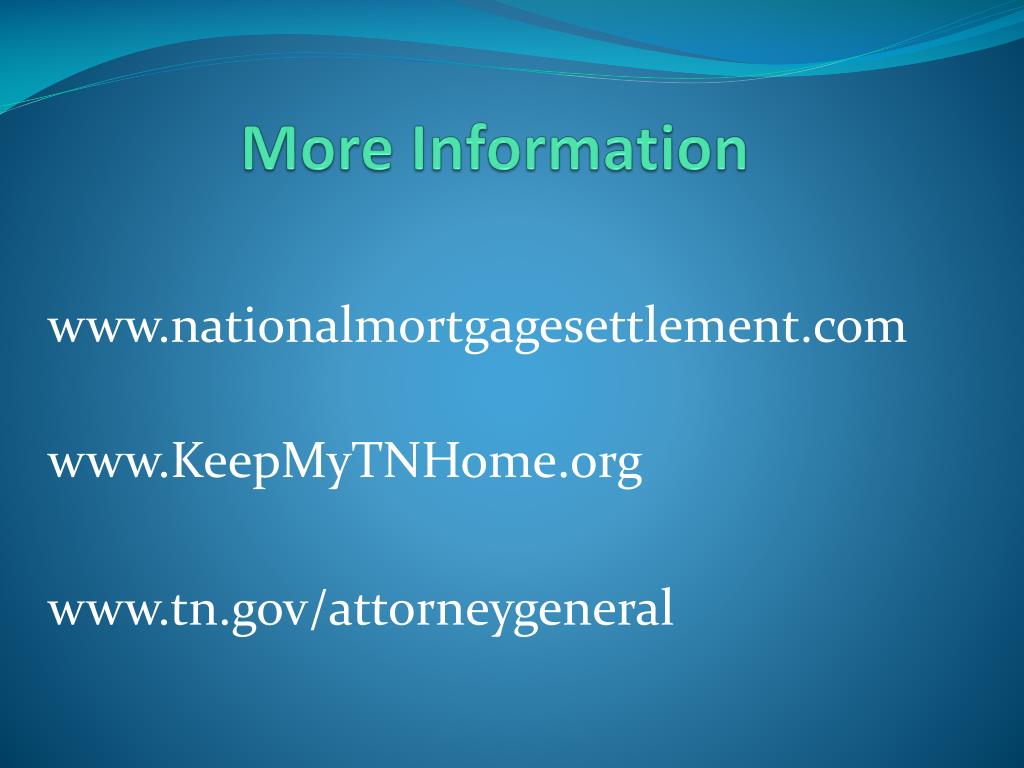 More Information www.nationalmortgagesettlement.com www.KeepMyTNHome.org www.tn.gov/attorneygeneral