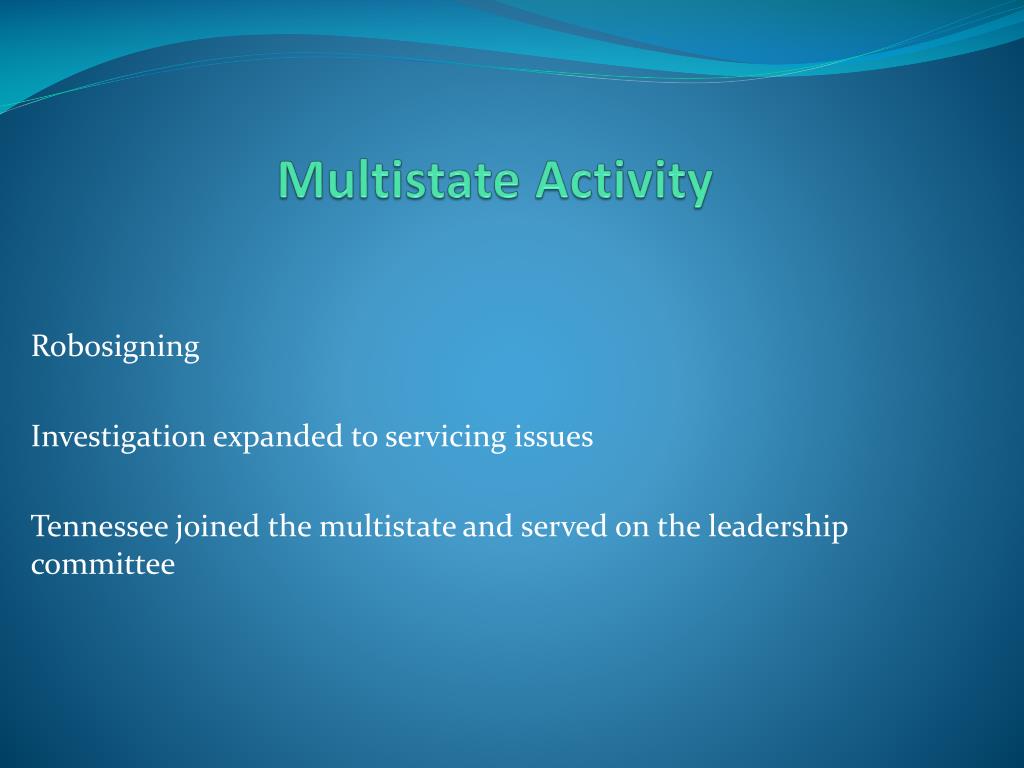 Multistate Activity Robosigning Investigation expanded to servicing issues Tennessee joined the multistate and served on the leadership committee