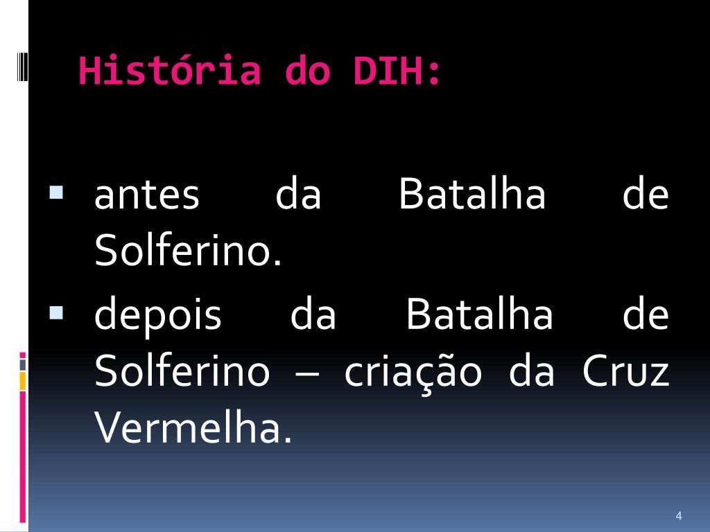 História do DIH: • antes da Batalha de Solferino. • depois da Batalha de Solferino – criação da Cruz Vermelha.