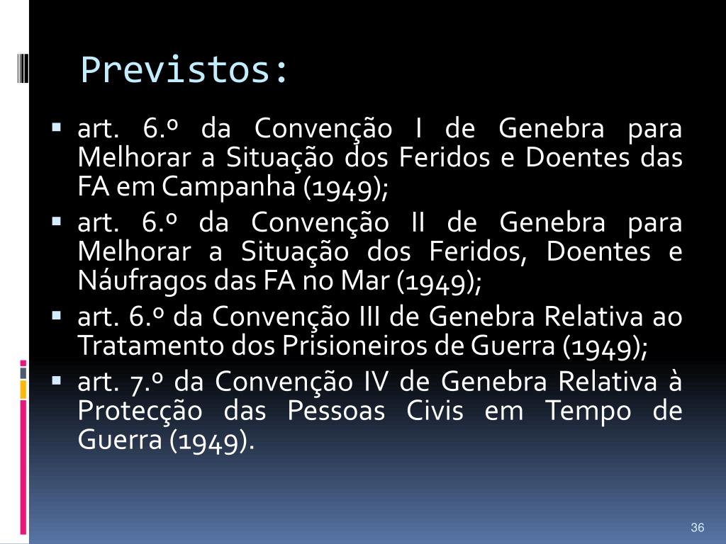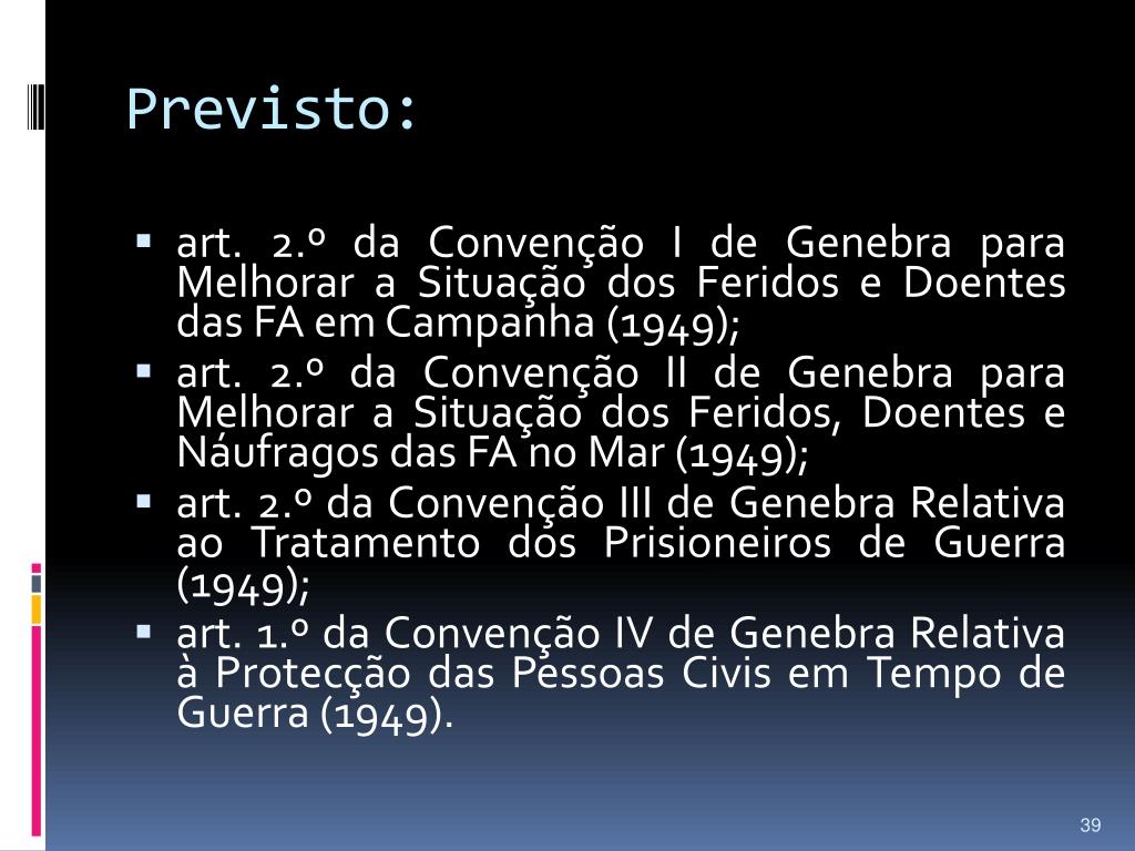 Previsto: • art. 2.º da Convenção I de Genebra para Melhorar a Situação dos Feridos e Doentes das FA em Campanha (1949); • art. 2.º da Convenção II de Genebra para Melhorar a Situação dos Feridos, Doentes e Náufragos das FA no Mar (1949); • art. 2.º da Convenção III de Genebra Relativa ao Tratamento dos Prisioneiros de Guerra (1949); • art. 1.º da Convenção IV de Genebra Relativa à Protecção das Pessoas Civis em Tempo de Guerra (1949).