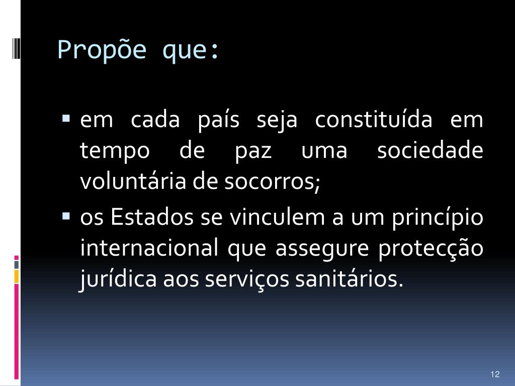 Propõe que: • em cada país seja constituída em tempo de paz uma sociedade voluntária de socorros; • os Estados se vinculem a um princípio internacional que assegure protecção jurídica aos serviços sanitários.