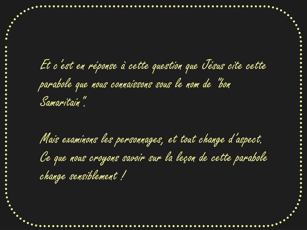 Et c’est en réponse à cette question que Jésus cite cette parabole que nous connaissons sous le nom de "bon Samaritain". Mais examinons les personnages, et tout change d’aspect. Ce que nous croyons savoir sur la leçon de cette parabole change sensiblement !