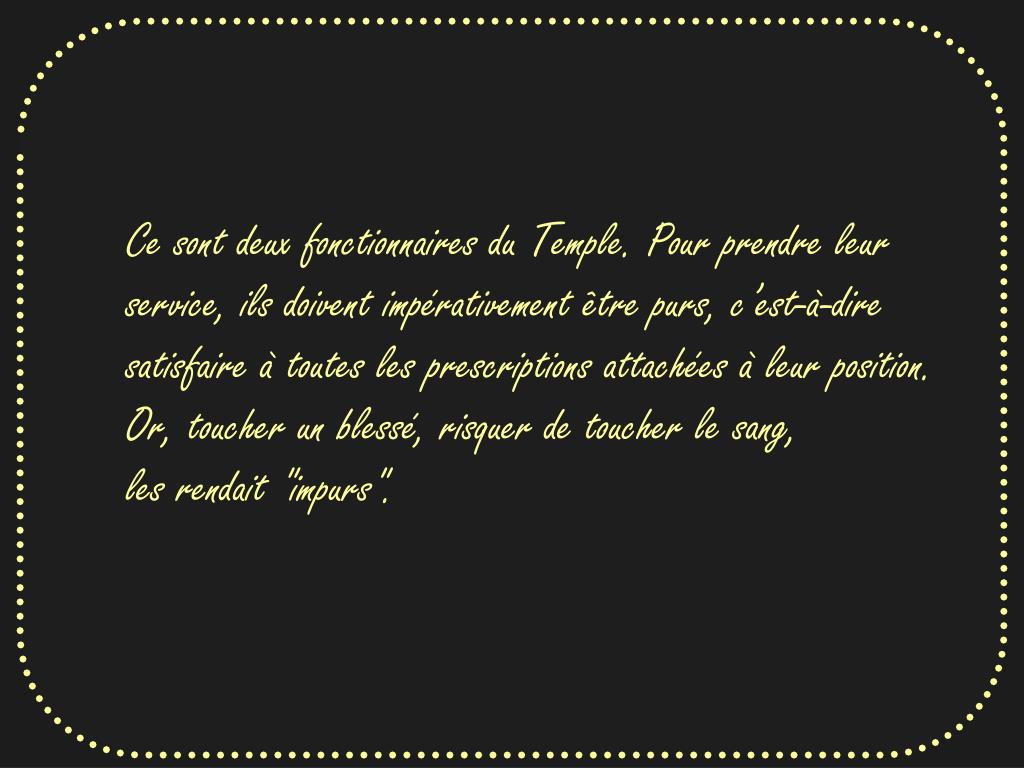 Ce sont deux fonctionnaires du Temple. Pour prendre leur service, ils doivent impérativement être purs, c’est-à-dire satisfaire à toutes les prescriptions attachées à leur position. Or, toucher un blessé, risquer de toucher le sang, les rendait "impurs".