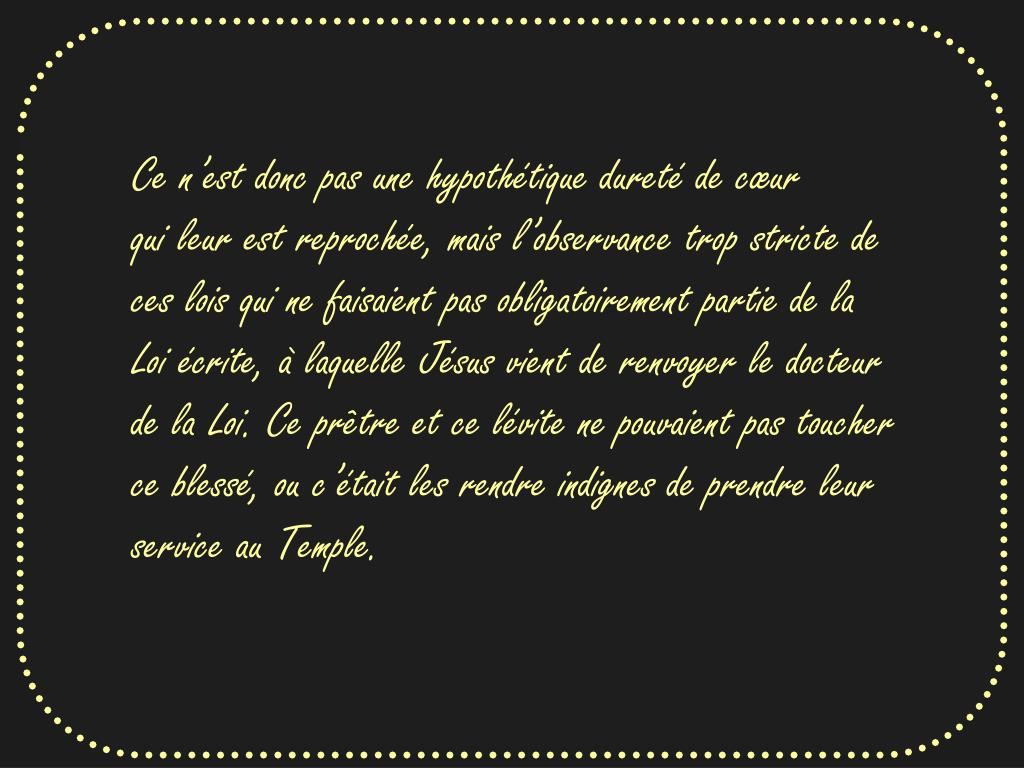 Ce n’est donc pas une hypothétique dureté de cœur qui leur est reprochée, mais l’observance trop stricte de ces lois qui ne faisaient pas obligatoirement partie de la Loi écrite, à laquelle Jésus vient de renvoyer le docteur de la Loi. Ce prêtre et ce lévite ne pouvaient pas toucher ce blessé, ou c’était les rendre indignes de prendre leur service au Temple.