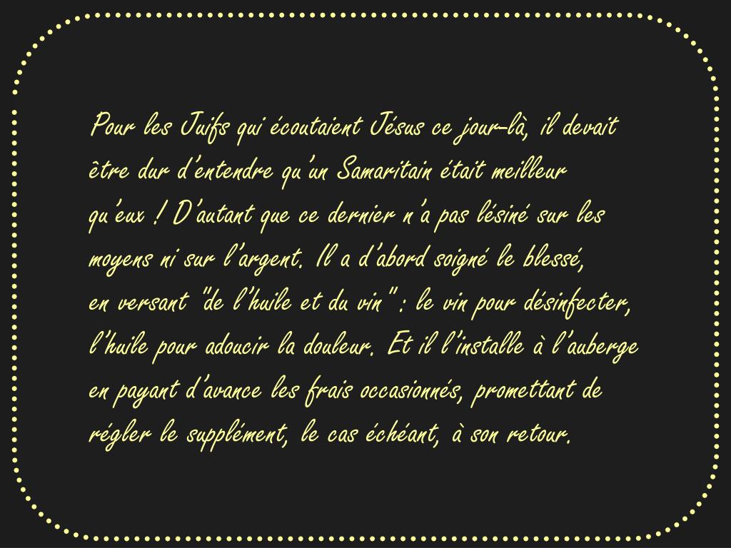 Pour les Juifs qui écoutaient Jésus ce jour-là, il devait être dur d’entendre qu’un Samaritain était meilleur qu’eux ! D’autant que ce dernier n’a pas lésiné sur les moyens ni sur l’argent. Il a d’abord soigné le blessé, en versant "de l’huile et du vin" : le vin pour désinfecter, l’huile pour adoucir la douleur. Et il l’installe à l’auberge en payant d’avance les frais occasionnés, promettant de régler le supplément, le cas échéant, à son retour.