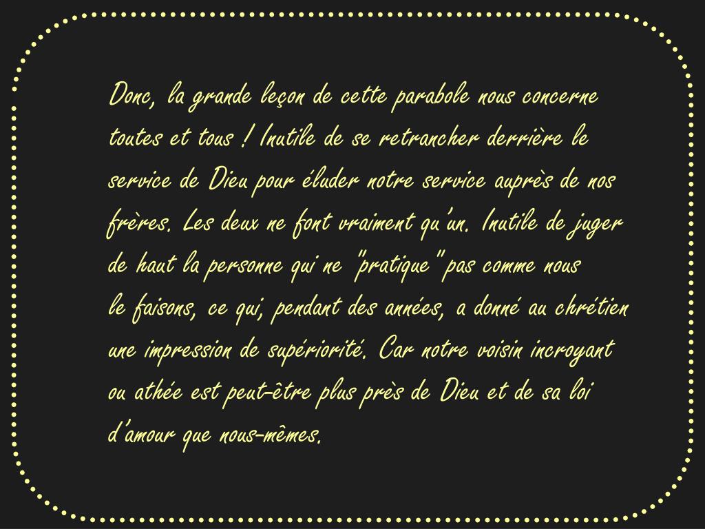 Donc, la grande leçon de cette parabole nous concerne toutes et tous ! Inutile de se retrancher derrière le service de Dieu pour éluder notre service auprès de nos frères. Les deux ne font vraiment qu’un. Inutile de juger de haut la personne qui ne "pratique" pas comme nous le faisons, ce qui, pendant des années, a donné au chrétien une impression de supériorité. Car notre voisin incroyant ou athée est peut-être plus près de Dieu et de sa loi d’amour que nous-mêmes.