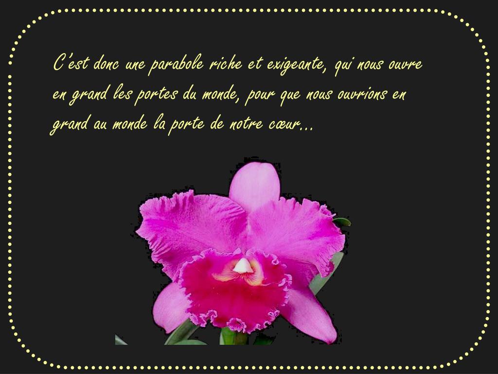 C’est donc une parabole riche et exigeante, qui nous ouvre en grand les portes du monde, pour que nous ouvrions en grand au monde la porte de notre cœur…