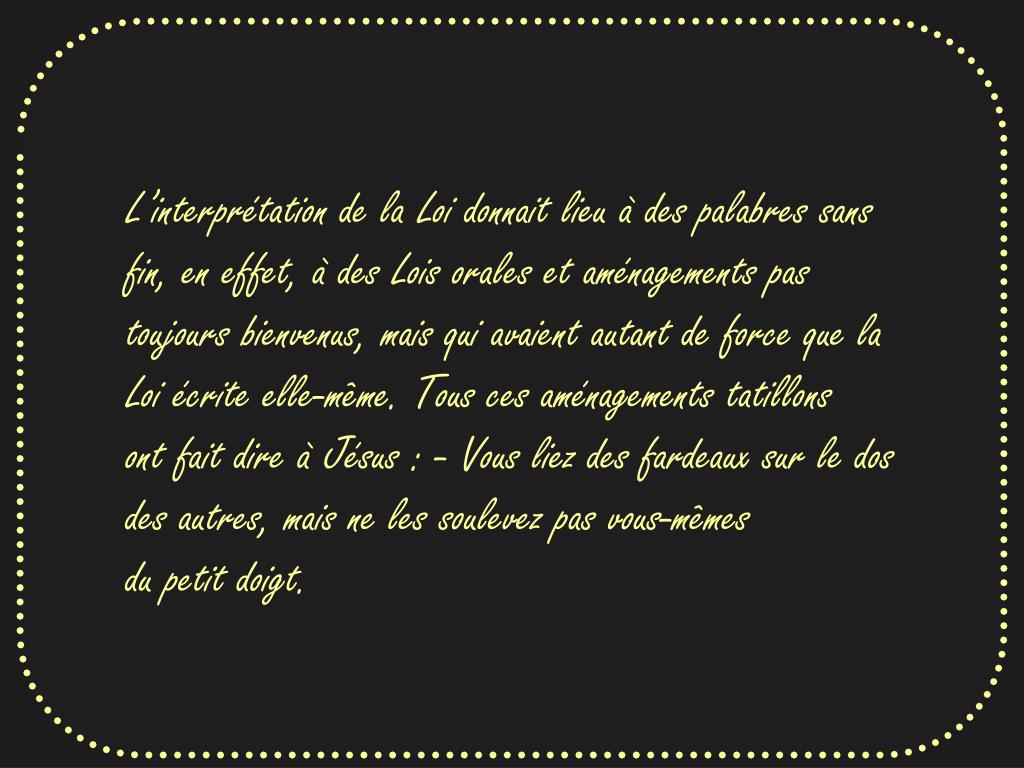 L’interprétation de la Loi donnait lieu à des palabres sans fin, en effet, à des Lois orales et aménagements pas toujours bienvenus, mais qui avaient autant de force que la Loi écrite elle-même. Tous ces aménagements tatillons ont fait dire à Jésus : - Vous liez des fardeaux sur le dos des autres, mais ne les soulevez pas vous-mêmes du petit doigt.