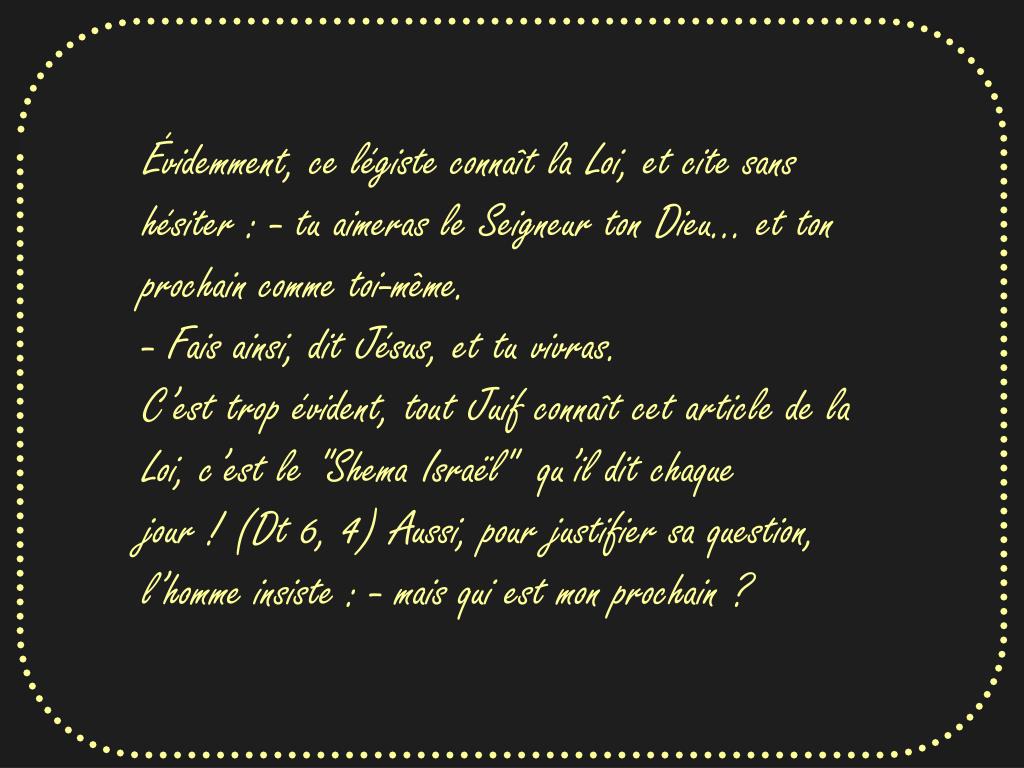 Évidemment, ce légiste connaît la Loi, et cite sans hésiter : - tu aimeras le Seigneur ton Dieu… et ton prochain comme toi-même. - Fais ainsi, dit Jésus, et tu vivras. C’est trop évident, tout Juif connaît cet article de la Loi, c’est le "Shema Israël" qu’il dit chaque jour ! (Dt 6, 4) Aussi, pour justifier sa question, l’homme insiste : - mais qui est mon prochain ?