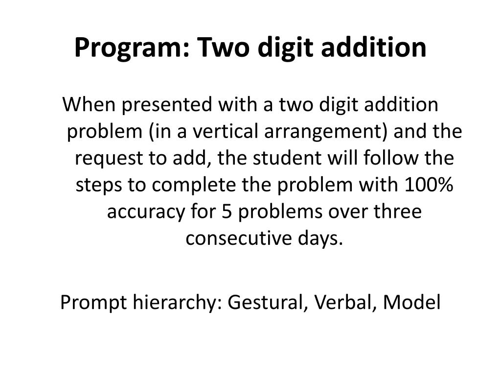 Program: Two digit addition When presented with a two digit addition problem (in a vertical arrangement) and the request to add, the student will follow the steps to complete the problem with 100% accuracy for 5 problems over three consecutive days. Prompt hierarchy: Gestural, Verbal, Model