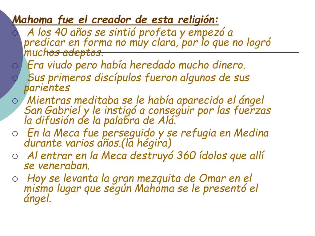 Mahoma fue el creador de esta religión: • A los 40 años se sintió profeta y empezó a predicar en forma no muy clara, por lo que no logró muchos adeptos. • Era viudo pero había heredado mucho dinero. • Sus primeros discípulos fueron algunos de sus parientes • Mientras meditaba se le había aparecido el ángel San Gabriel y le instigó a conseguir por las fuerzas la difusión de la palabra de Alá. • En la Meca fue perseguido y se refugia en Medina durante varios años.(la hégira) • Al entrar en la Meca destruyó 360 ídolos que allí se veneraban. • Hoy se levanta la gran mezquita de Omar en el mismo lugar que según Mahoma se le presentó el ángel.