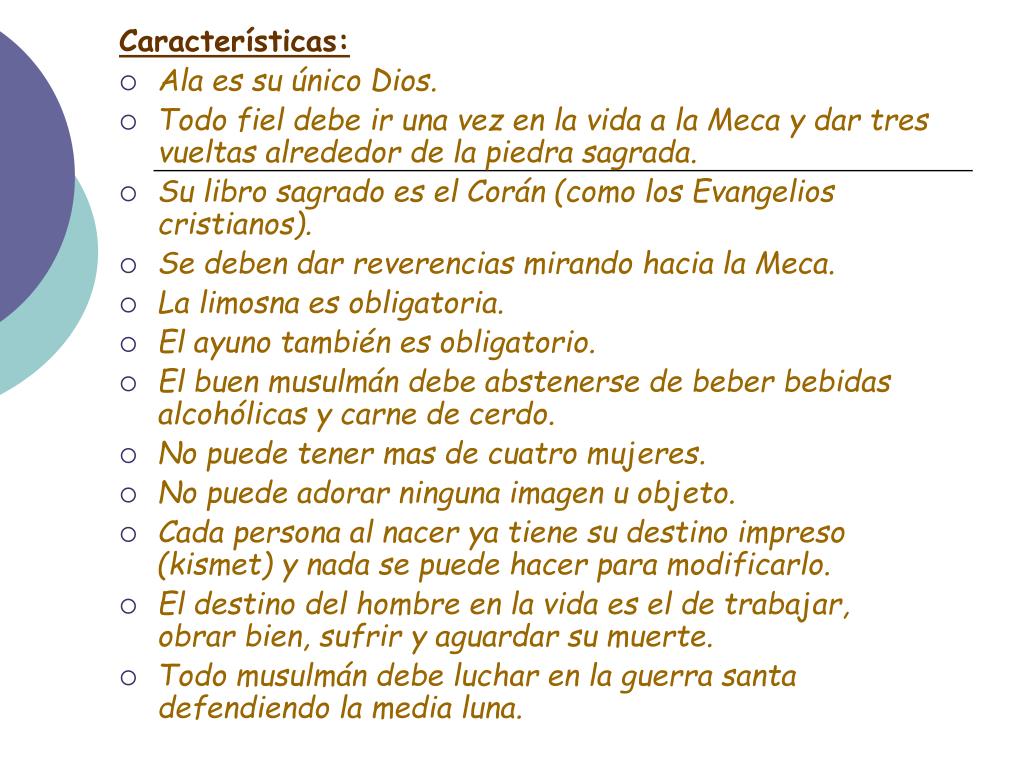 Características: • Ala es su único Dios. • Todo fiel debe ir una vez en la vida a la Meca y dar tres vueltas alrededor de la piedra sagrada. • Su libro sagrado es el Corán (como los Evangelios cristianos). • Se deben dar reverencias mirando hacia la Meca. • La limosna es obligatoria. • El ayuno también es obligatorio. • El buen musulmán debe abstenerse de beber bebidas alcohólicas y carne de cerdo. • No puede tener mas de cuatro mujeres. • No puede adorar ninguna imagen u objeto. • Cada persona al nacer ya tiene su destino impreso (kismet) y nada se puede hacer para modificarlo. • El destino del hombre en la vida es el de trabajar, obrar bien, sufrir y aguardar su muerte. • Todo musulmán debe luchar en la guerra santa defendiendo la media luna.