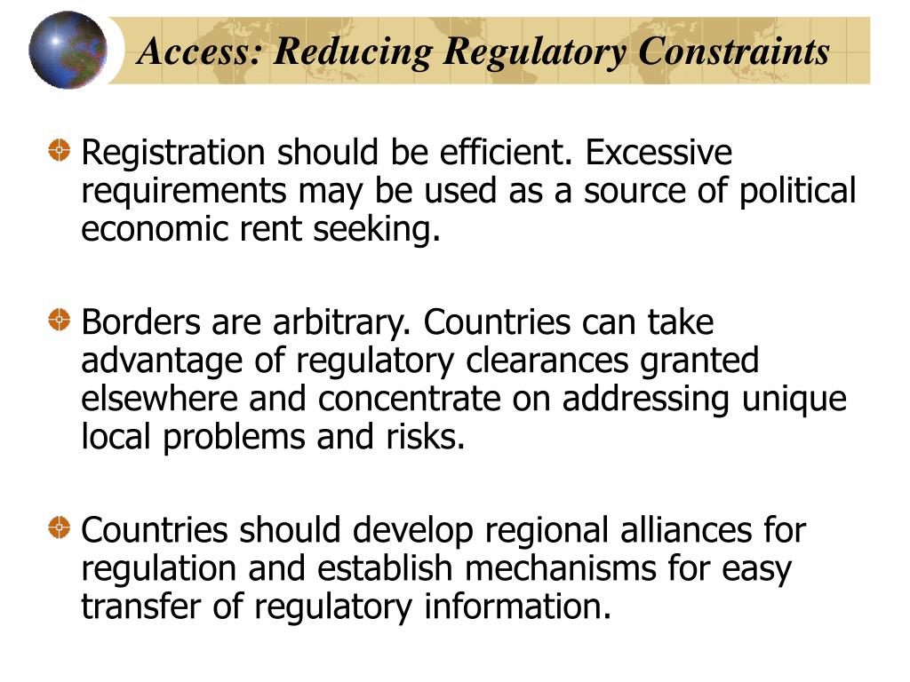Access: Reducing Regulatory Constraints • Registration should be efficient. Excessive requirements may be used as a source of political economic rent seeking. • Borders are arbitrary. Countries can take advantage of regulatory clearances granted elsewhere and concentrate on addressing unique local problems and risks. • Countries should develop regional alliances for regulation and establish mechanisms for easy transfer of regulatory information.