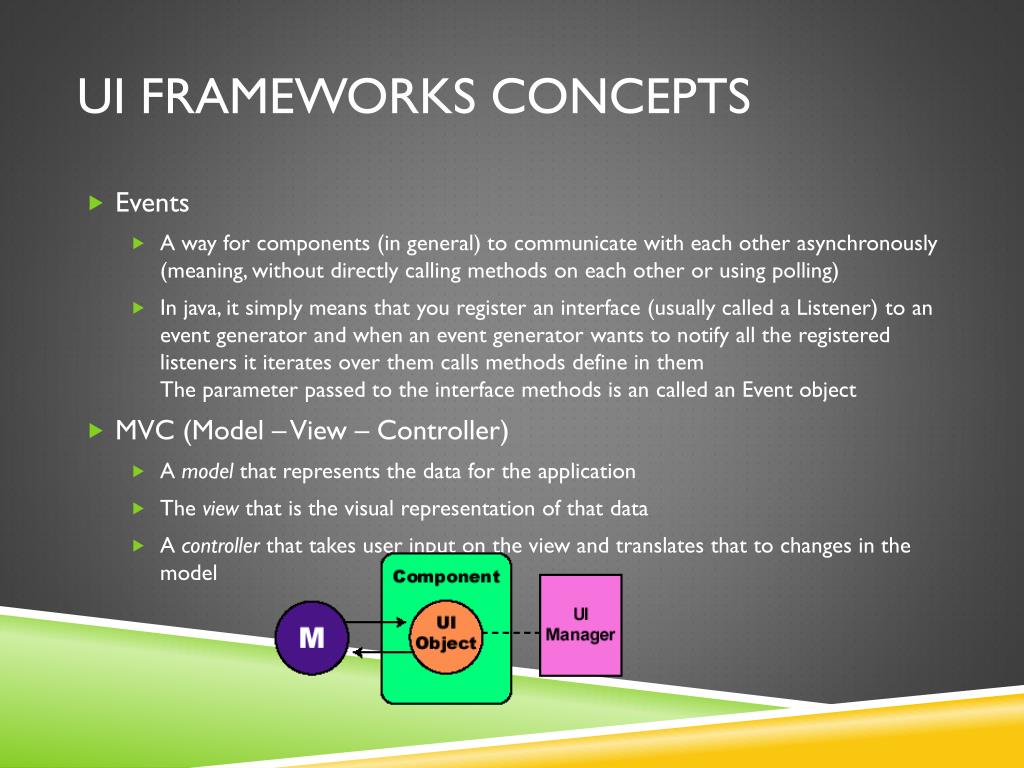 UI Frameworks Concepts • Events • A way for components (in general) to communicate with each other asynchronously (meaning, without directly calling methods on each other or using polling) • In java, it simply means that you register an interface (usually called a Listener) to an event generator and when an event generator wants to notify all the registered listeners it iterates over them calls methods define in themThe parameter passed to the interface methods is an called an Event object • MVC (Model – View – Controller) • A model that represents the data for the application • The view that is the visual representation of that data • A controller that takes user input on the view and translates that to changes in the model