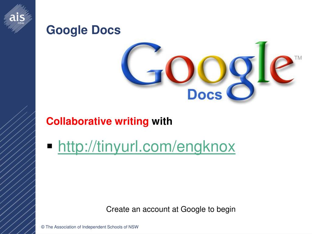 Google Docs Collaborative writing with • http://tinyurl.com/engknox Create an account at Google to begin